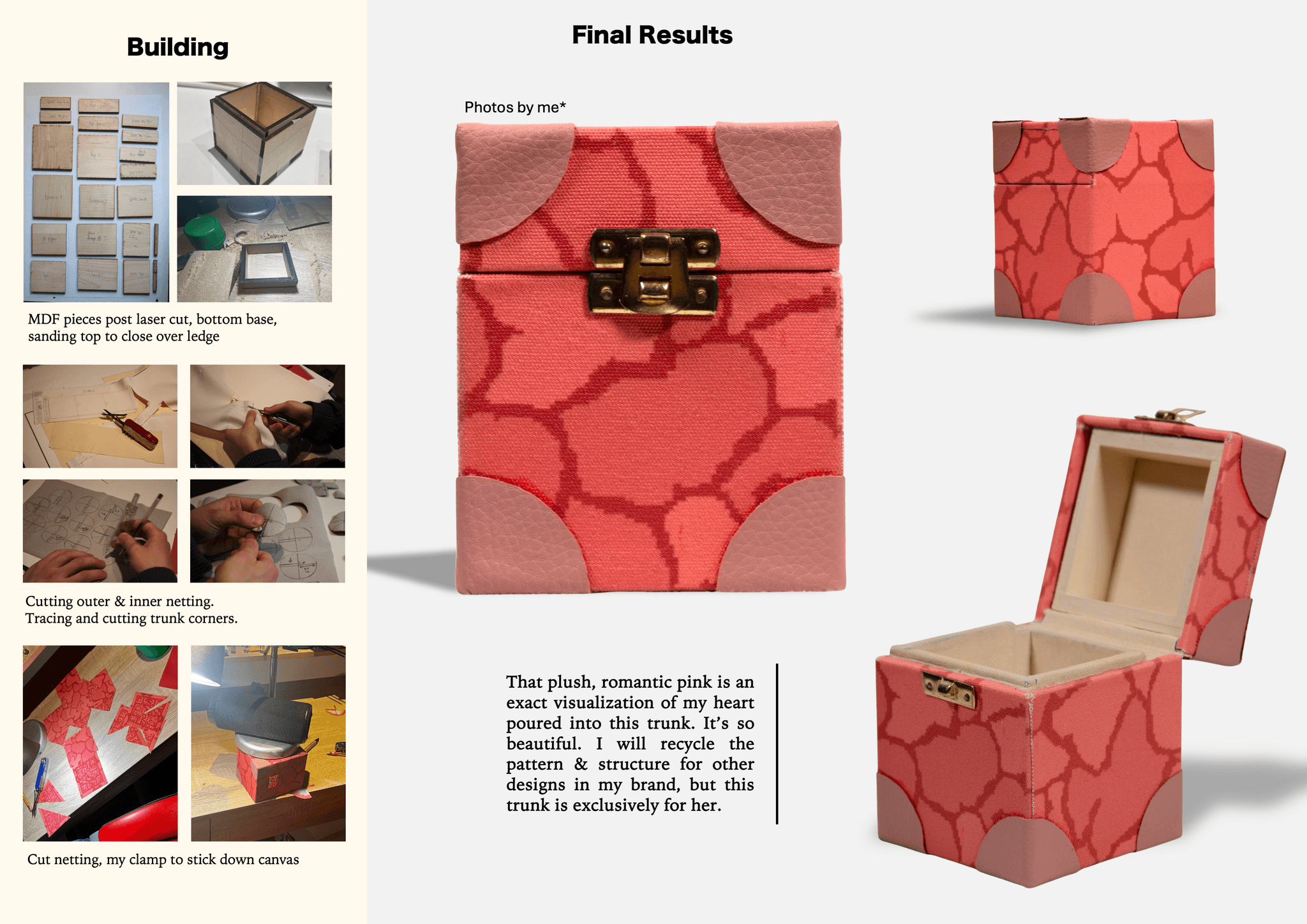 It is a gift for a girl I like (hence its name), though the dimensions/netting will be retained for future trunks in my brand, Luka Fernada