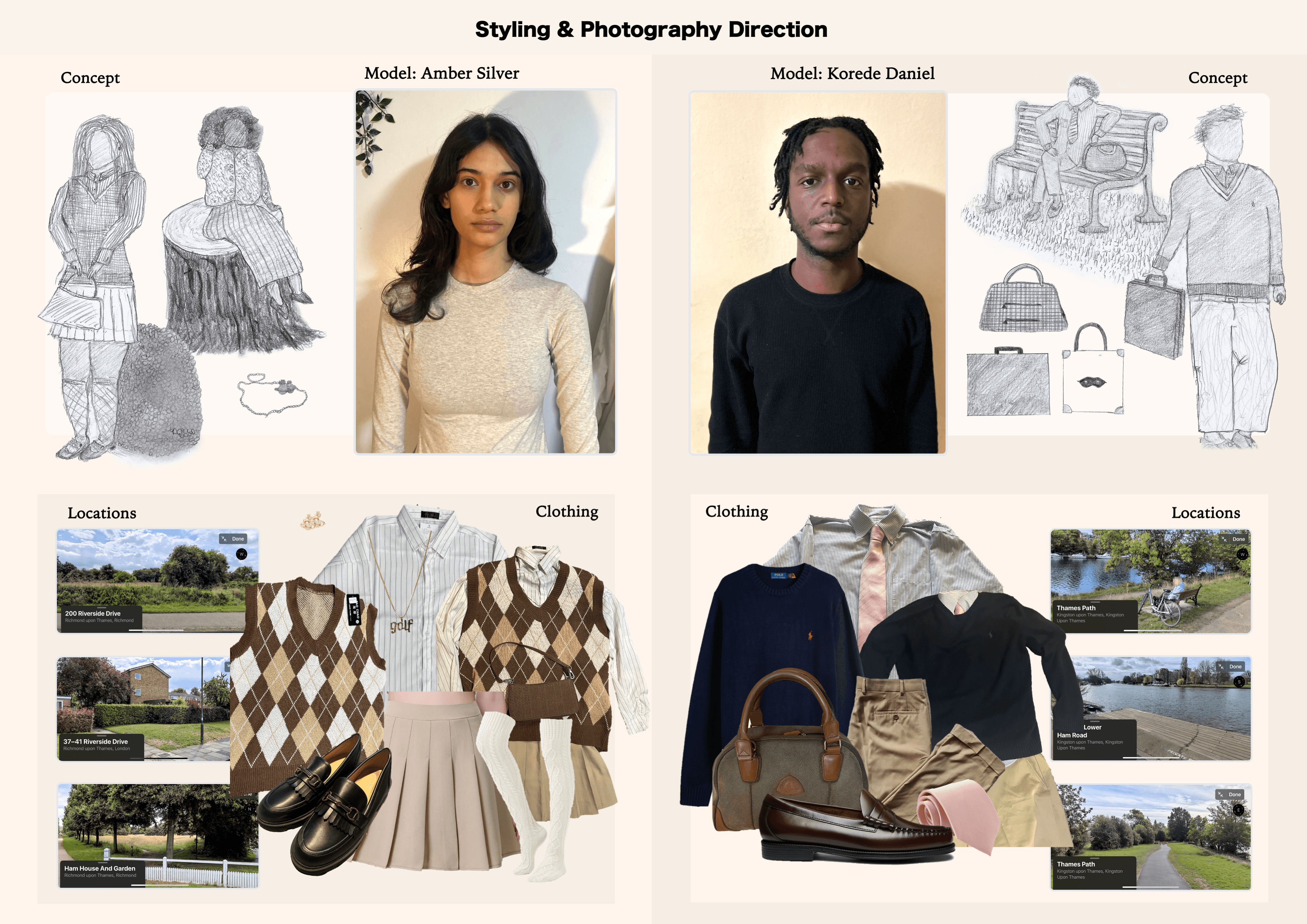 Planning components for photoshoot: visual shot concepts, confirmed models, clothing pieces, shoot locations